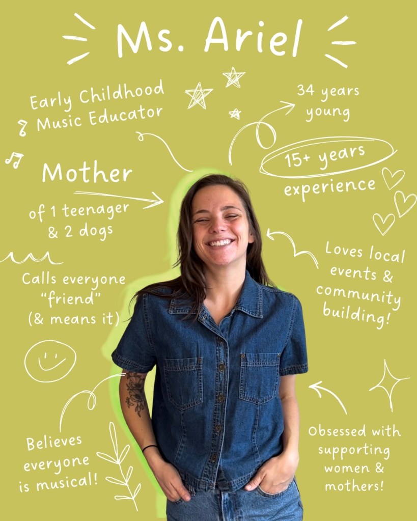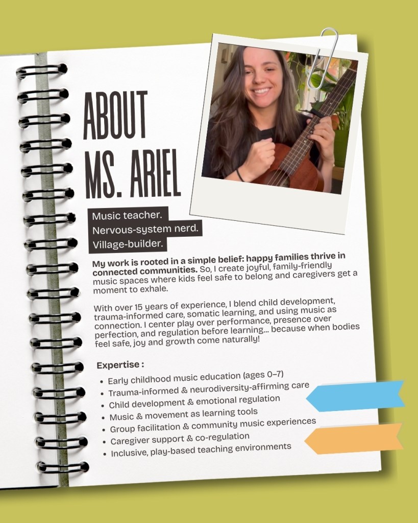 Drawing from her background in early childhood education, music instruction, somatic movement, and behavioral care, Ariel designs experiences that support both developmental growth and emotional well-being while remaining joyful and accessible.